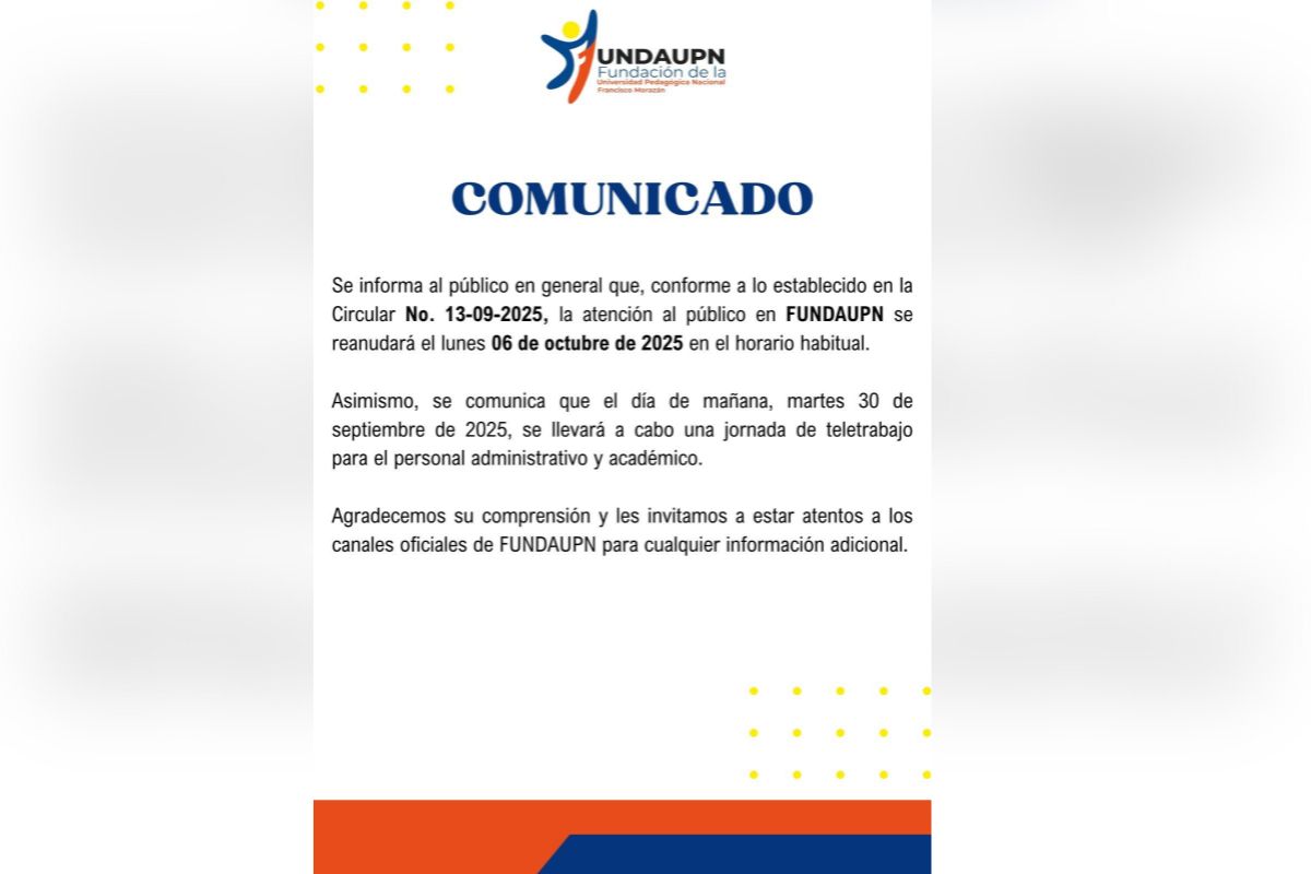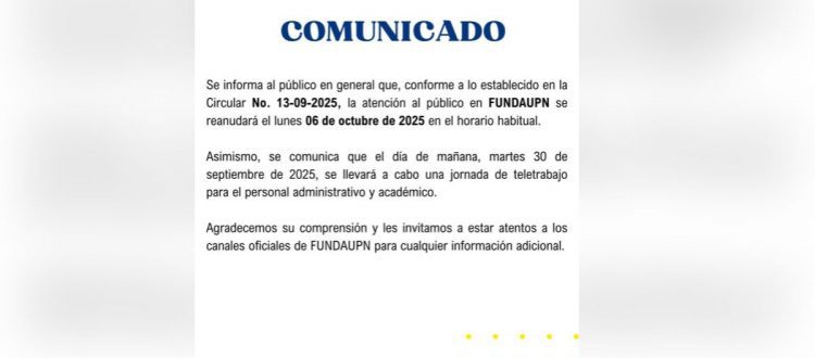 El personal administrativo y académico de la FUNDAUPN de Tegucigalpa realizará jornada de teletrabajo este martes 29 de septiembre. Le anunciamos a nuestra comunidad que atenderemos de manera presencial el lunes 6 de octubre