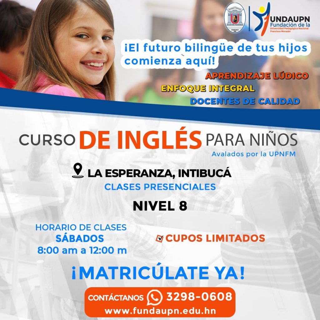 La Esperanza, Honduras.- Si su hijo ya cursó hasta el módulo 6 de nuestro Curso Especial de Inglés para Niños puede matricularse en los siguientes módulos para continuar su formación en la FUNDAUPN sede La Esperanza.