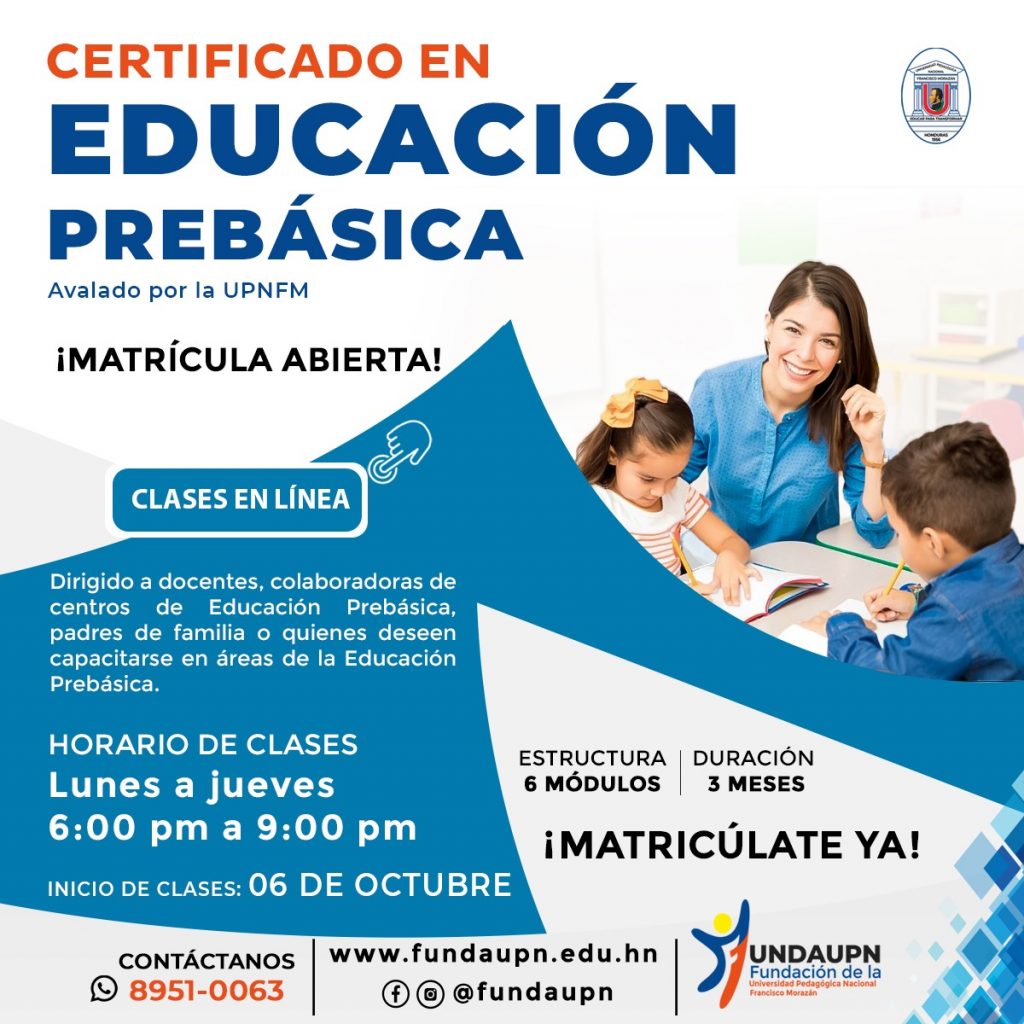 Tegucigalpa, Honduras.- Ya quedan pocos cupos para que matricularse en el Certificado de Educación Prebásica en la FUNDAUPN. Las clases son en línea de lunes a jueves de 6:00 a 9:00 de la noche.